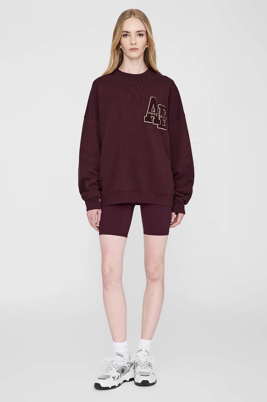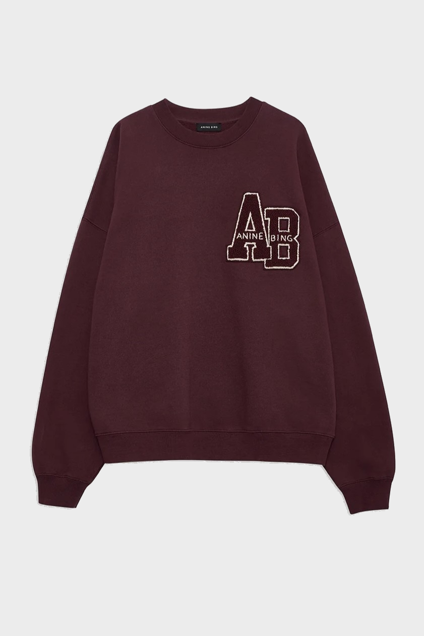 The Miles Oversized Sweatshirt Letterman is a crewneck pullover made from midweight 100% cotton fleece in a dark burgundy wash. This relaxed casual features a custom ANINE BING letterman chenille patch graphic at the chest in tonal burgundy and white.