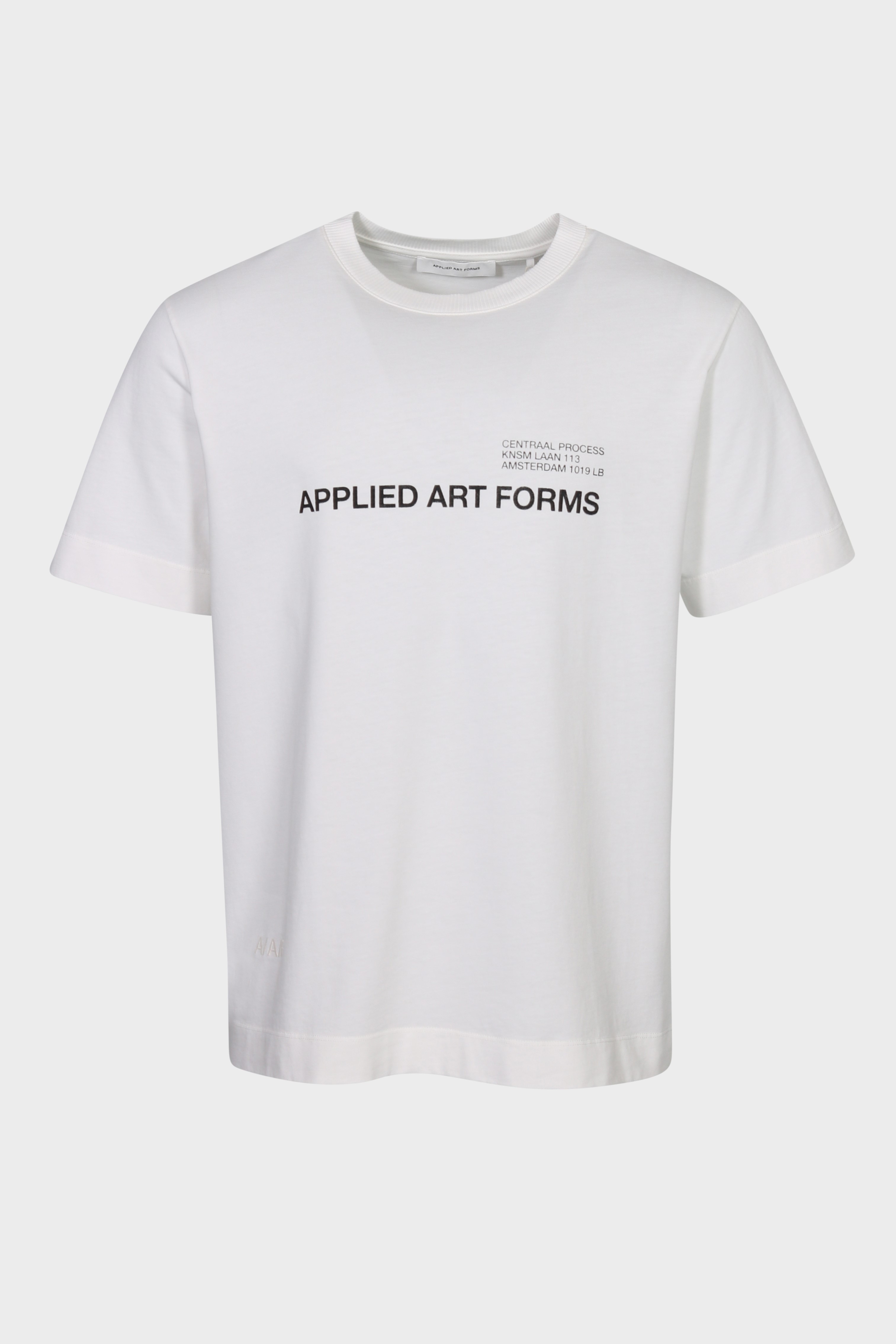 Features a handmade screen print of the Applied Art Forms logo. This T-shirt can be personalised with hand stenciled initials at the back.