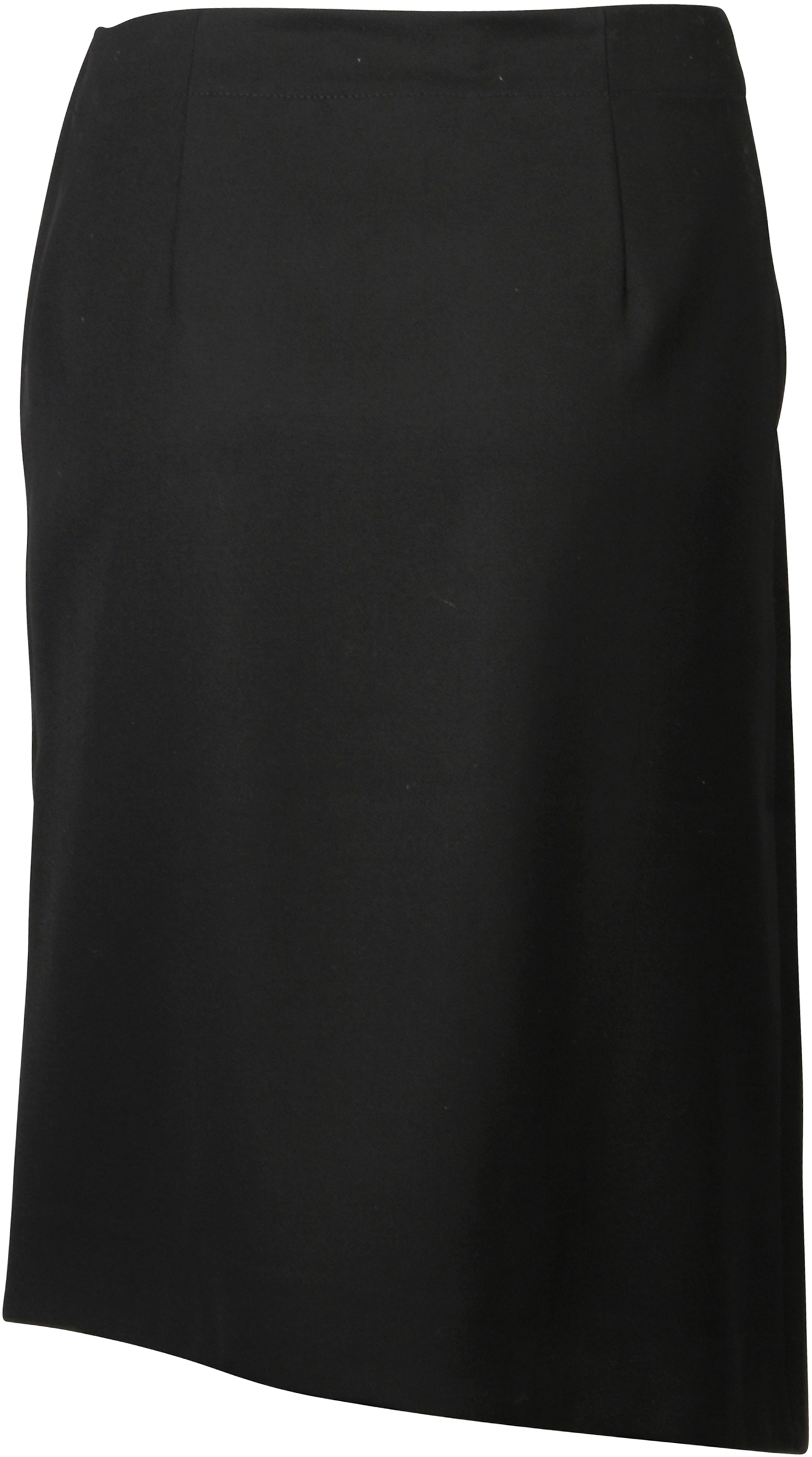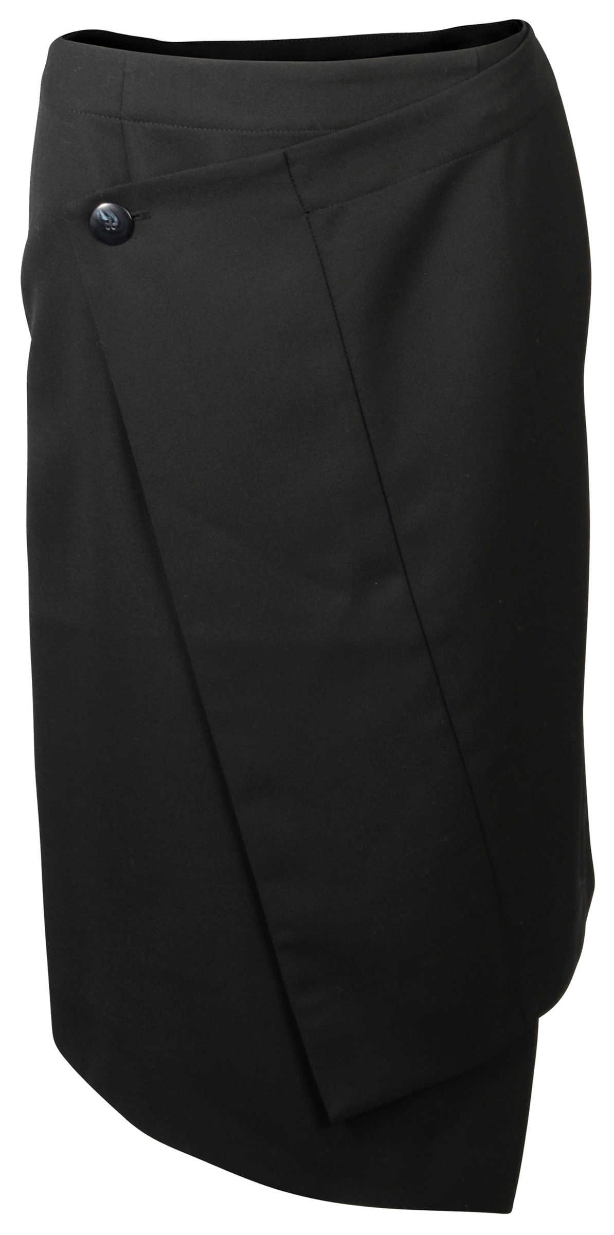 Asymmetrischer Midirock aus reiner Wolle in tiefschwarz mit zusätzlicher Knopfschließe.