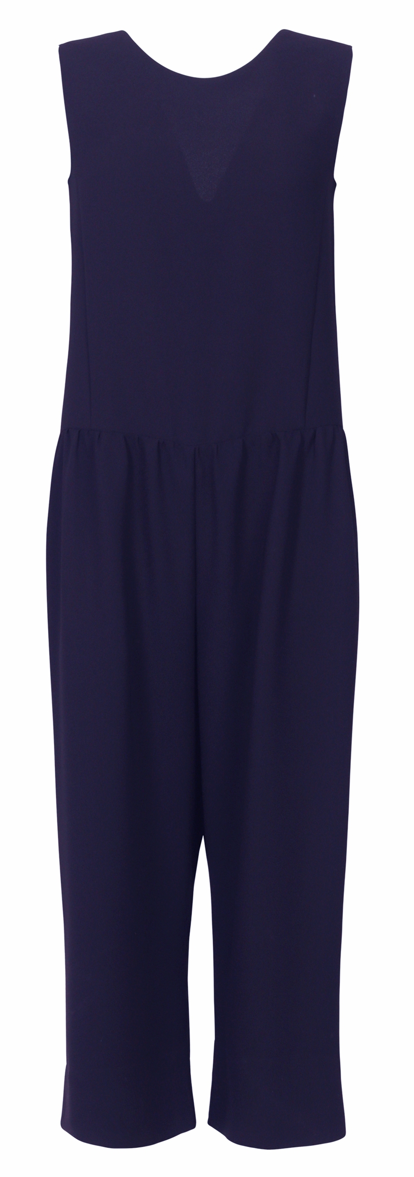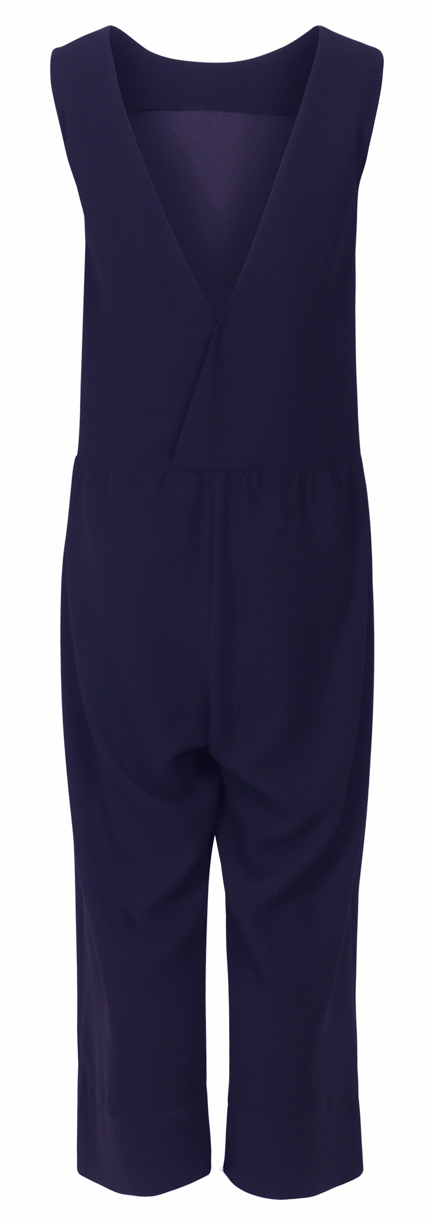 Shirtaporter, Modell: ju1322, Ûrmelloser, dunkelblauer Jumpsuit in entspannter Passform mit subtil-verfÙhrerischem V-Ausschnitt am RÙcken sowie locker fallenden Hosenbeinen. Figurumschmeichelnder Einteiler fÙr unkomplizierte Fashionfans! 100% Polyester, Made in Italy
