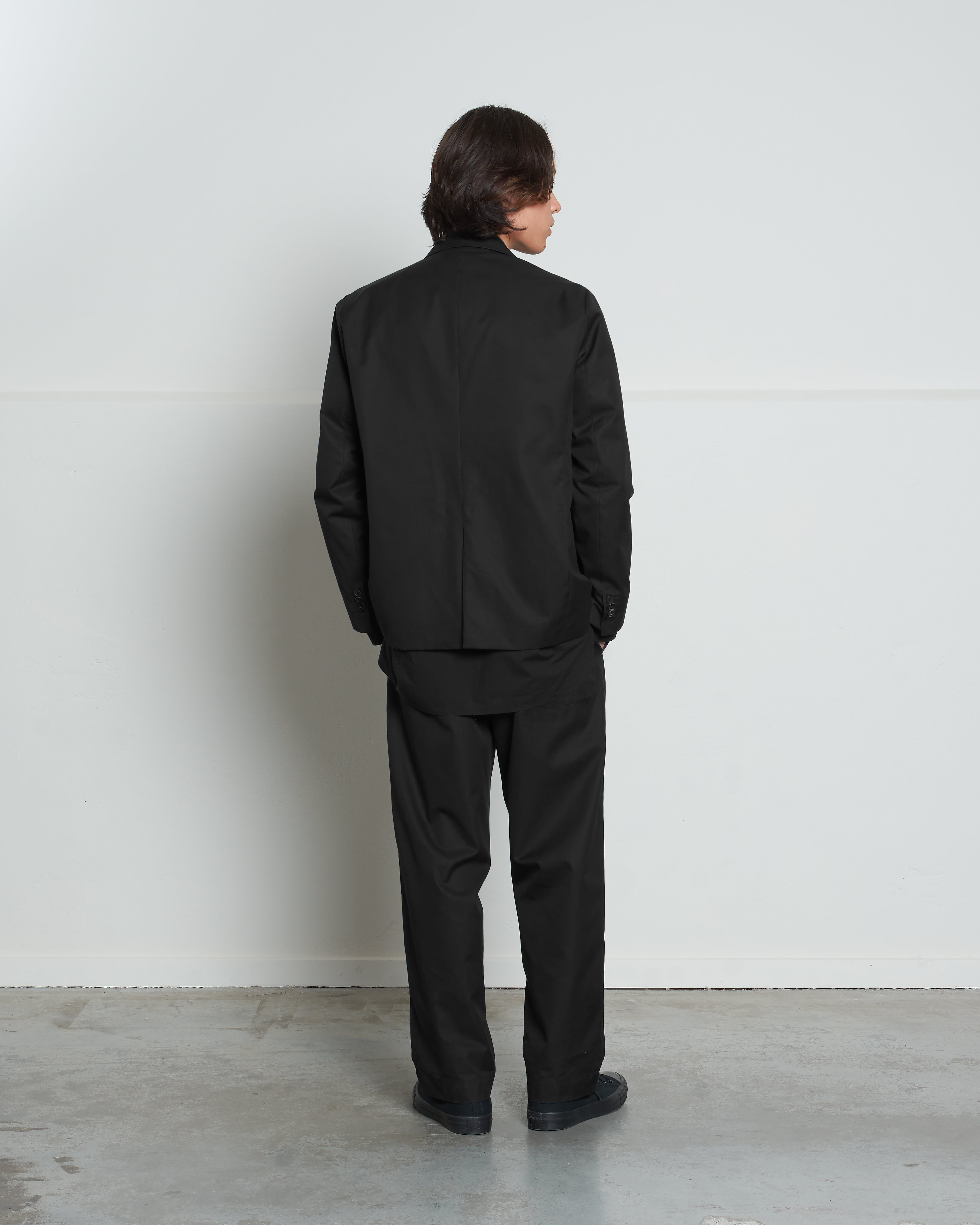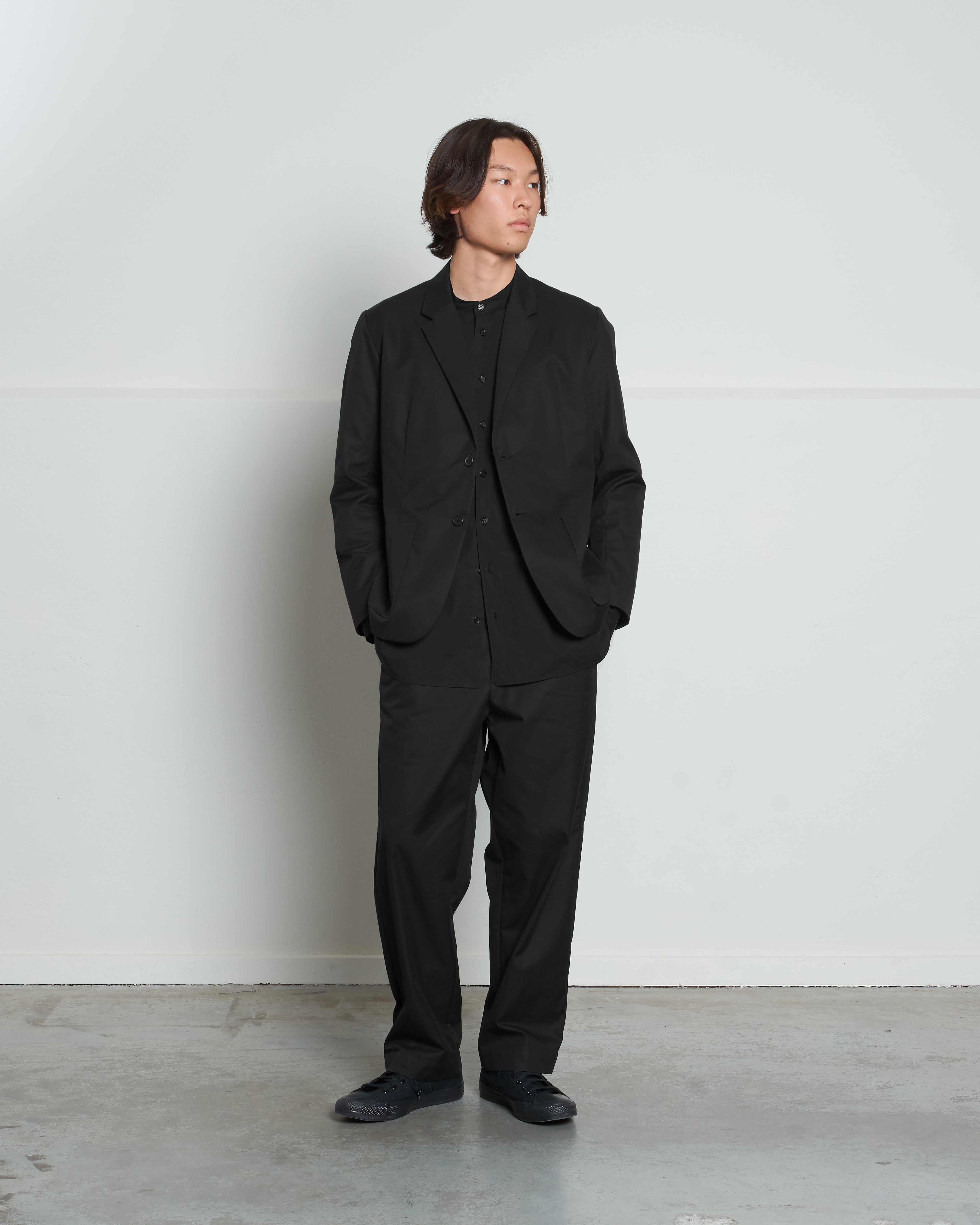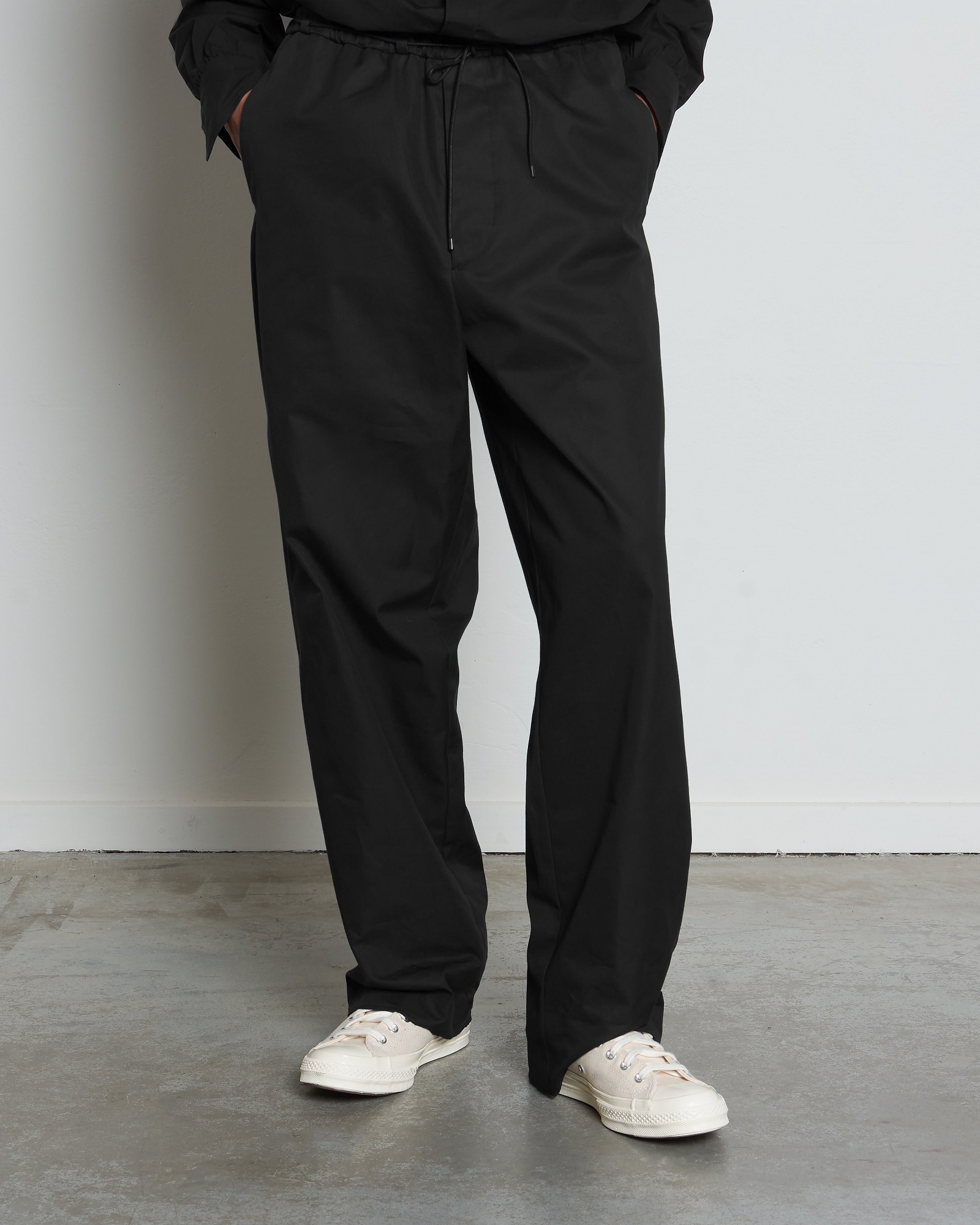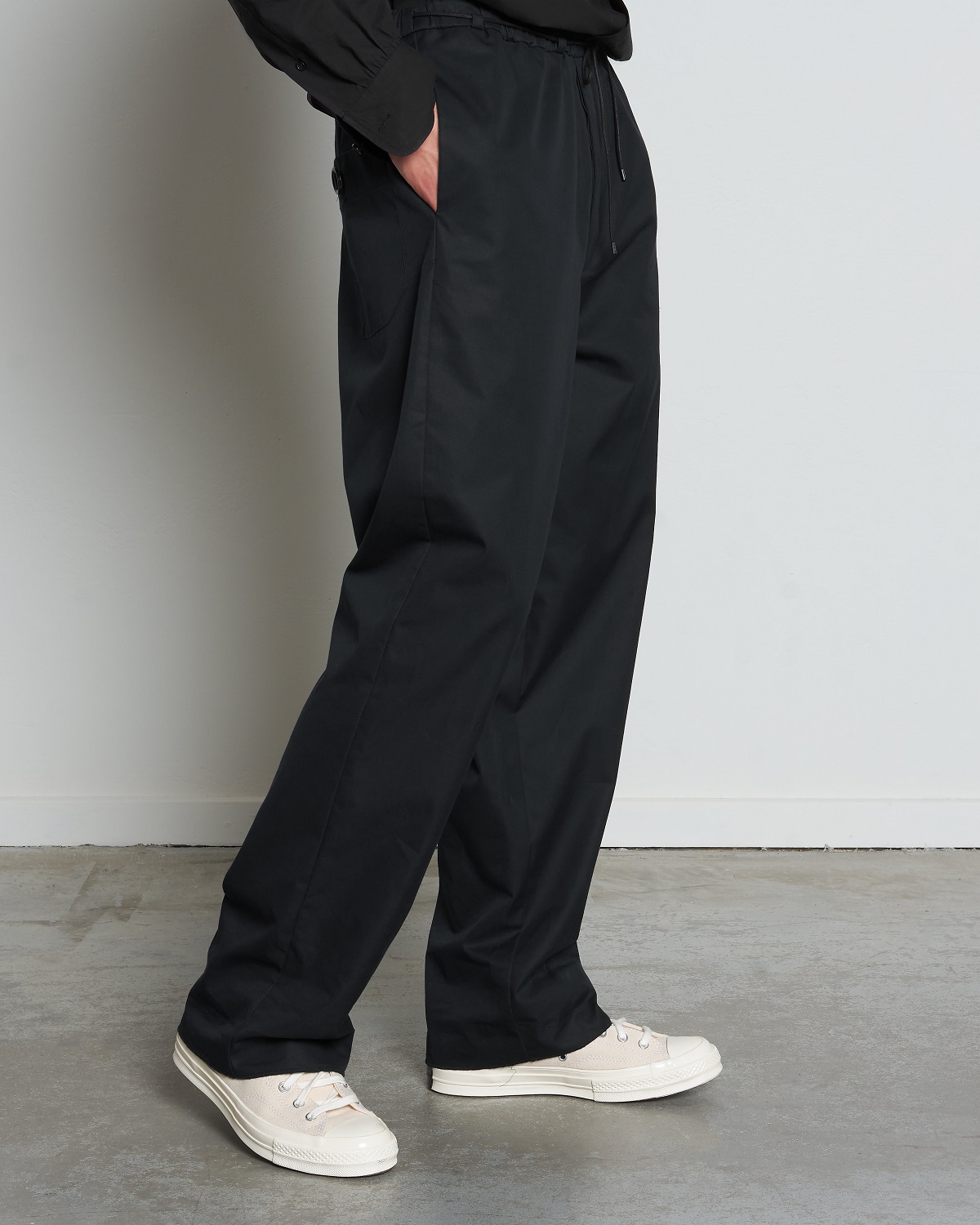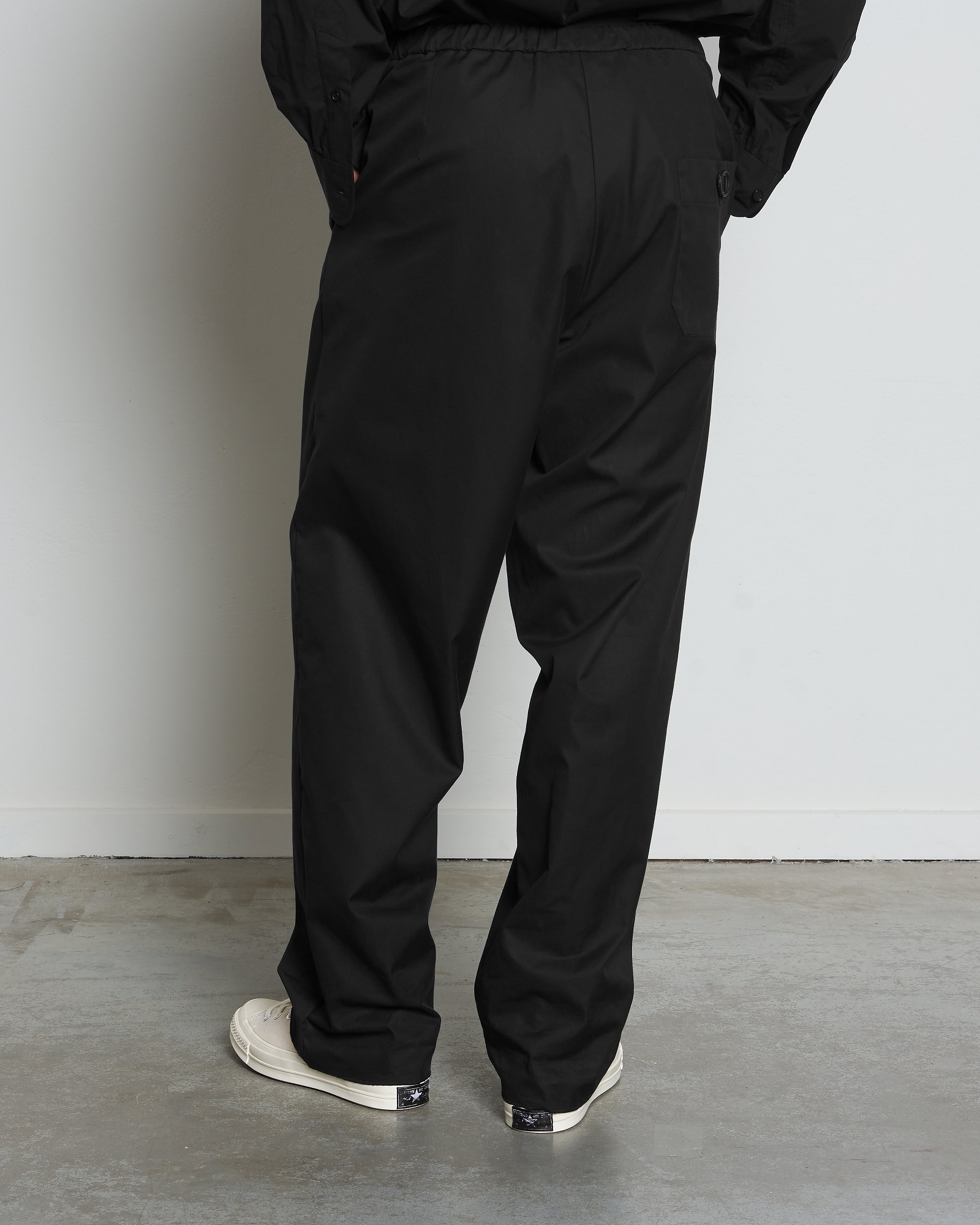 DM1-2 is a loose fit, wider block pant featuring an elasticated waistband. These comfortable pants have beautiful details like the drawstring fastening attached through a half-exposed cord tunnel and back pocket with our life vest-style bar button construction.