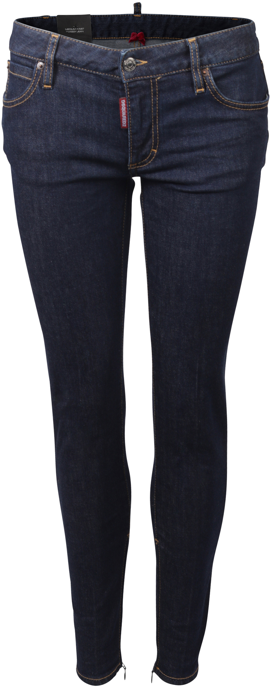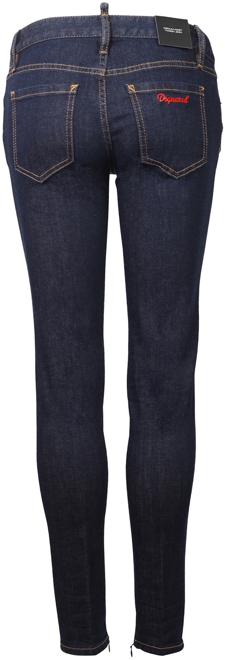 Skinny Premiumjeans in einem ungewaschenen Dunkelblau mit mittlerer Leibhöhe, Minizip am Fußende, schmalem Bein sowie rotem Dsquared Logo auf der rechten Gesäßtasche.